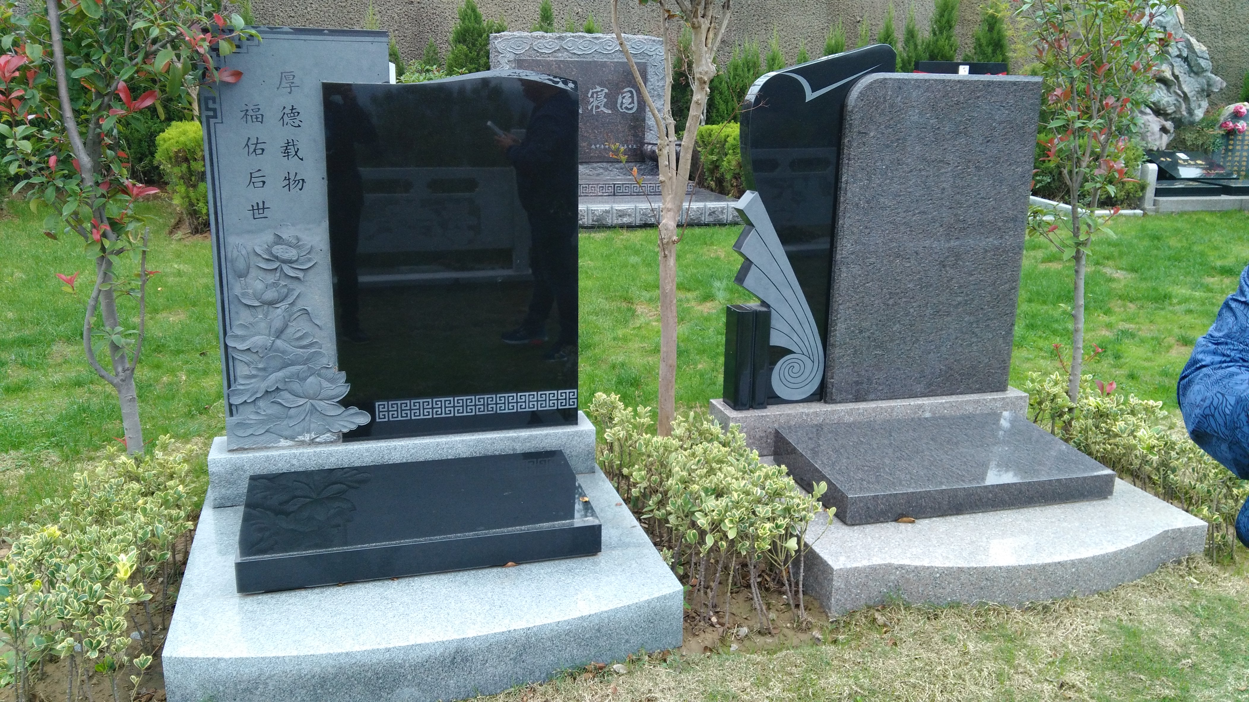 墓碑擁有文化底蘊,有了靈動性,有了性情美。人世一頁書,如詩如畫,天壽的藝術(shù)墓碑可以讓人生詩詞末端點睛再續(xù)輝煌,可以讓人生詩畫再添續(xù)集。。悼念者們在墓前送上一捧鮮花,與墓后方的一池碧水,一株柳樹交相輝映,更顯生機和浪漫。